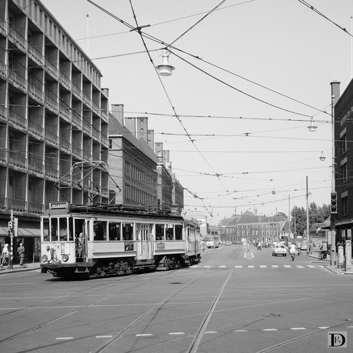 Tram Den Haag - Wassenaar rijdt van de Kalvermarkt het Spui op.