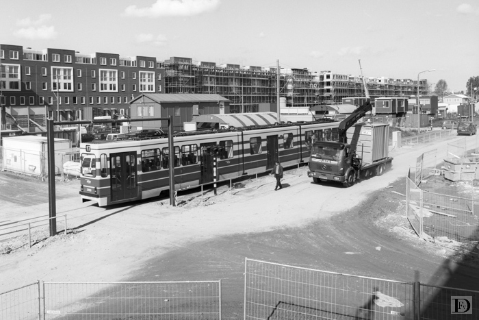 De portalen (ter weerszijden) voor de trambaan dienen om de bovenleiding te beschermen tegen te hoge bouwverkeer-auto's.