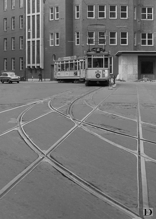 De Torenstraat bij de Grote Kerk met de oude sporensituatie, waarbij er nog een spoor rechtdoor van de Jan-Hendrikstraat naar de Torenstraat liep.