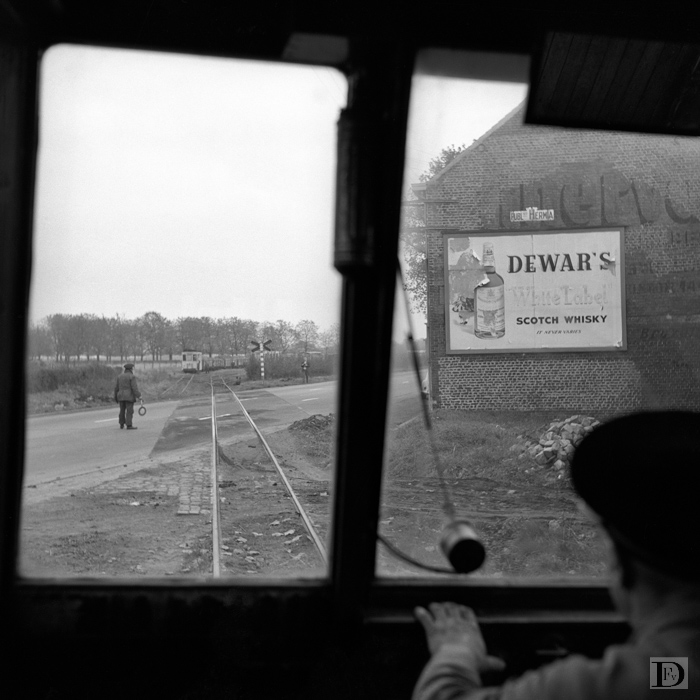 Uitzicht op de kruising van de autoweg Tienen - Sint Truiden (- Luik) en de niet-elektrische tramweg Jodoigne - Overhespen te Overhespen direct vóór het NMVB-station. Let op de conducteur met het spiegelei, die het verkeer ophoudt!