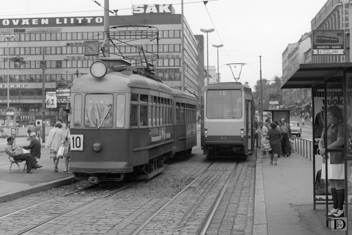 Links een twee-assig, oud spitsuur tramstel op lijn 10, rechts de achterzijde van het nieuwste materieel, geleed rijtuig 41 ook op lijn 10. Op deze foto staan het oudste en nieuwste trammaterieel wat in dienst was afgebeeld en zelfs op dezelfde lijn!