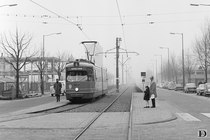 Wilgenplaslaan bij Meidoornsingel met emr. 604 op lijn 5 op de eerste dag van tramexploitatie in Schiebroek. Dit was een van de vier extra diensten, die op deze dag reden - tot C.S.