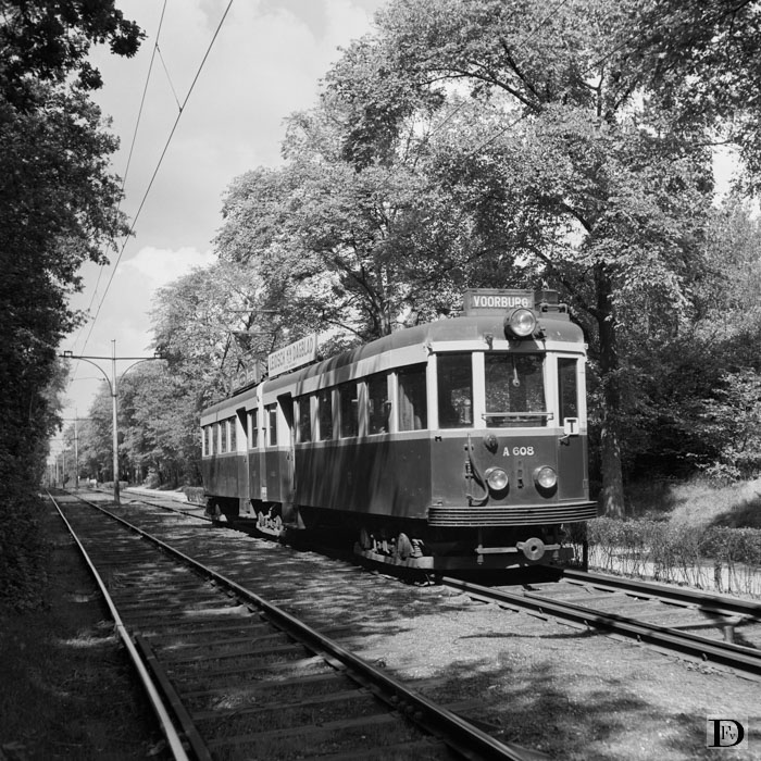 Tweelingrijtuig A 607/608 op de T dienst in de Scheveningse Bosjes bij de Badhuisweg op de lijn Voorburg - Scheveningen.