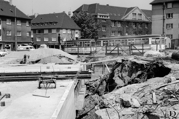 Ruhrschnellweg in aanbouw te Essen, Wickenburgstrasse. De tramrails zweven nog boven het niets!