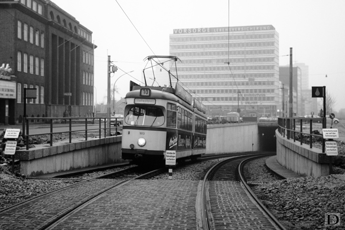 Uitrit aan de zuidzijde van de tunnel onder de Huyssenallee met geleed motorrijtuig 1613 op lijn 10.