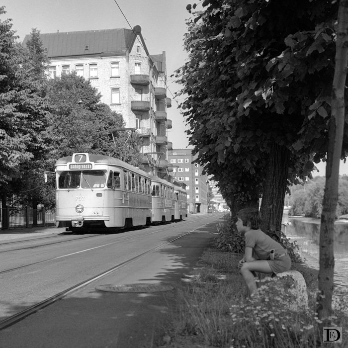 De Stampgatan, langs het water, met een driewagentram op lijn 7 richting station.