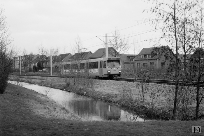 Tram richting Achterveld vlak voor de overweg en de halte.