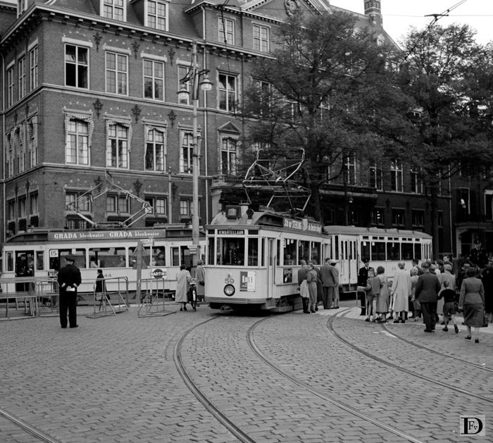 Een verkeersopstopping op de Vijverdam, die door een aantal controleurs van de HTM geregeld werd !