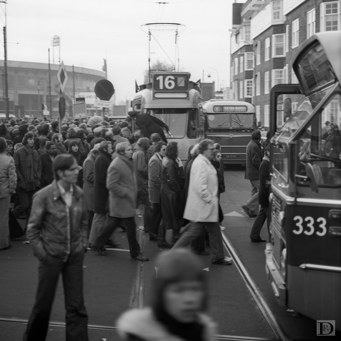 Openbaar vervoer in actie bij de afvoer van stadionbezoekers op een autoloze zondag bij een uitverkocht stadion.