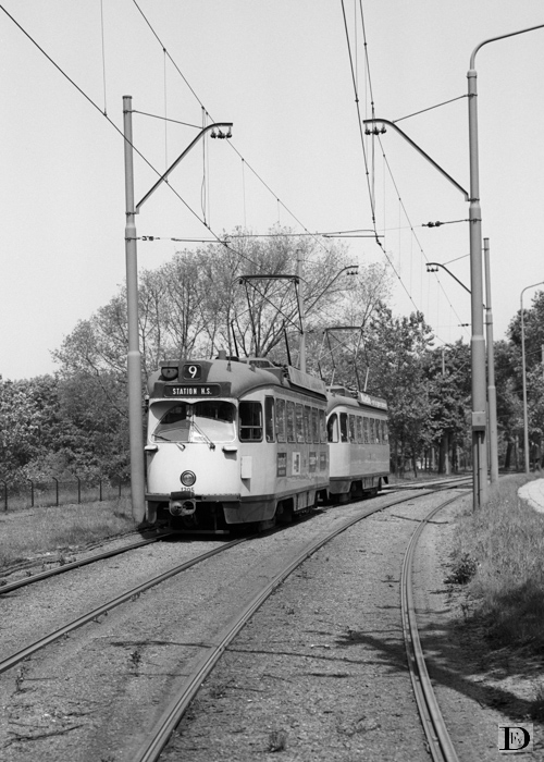 PCC-cars 1305 + 2101 op de Nieuwe Parklaan tussen Cremerweg en Wagenaarweg, en route naar Station Hollands Spoor.