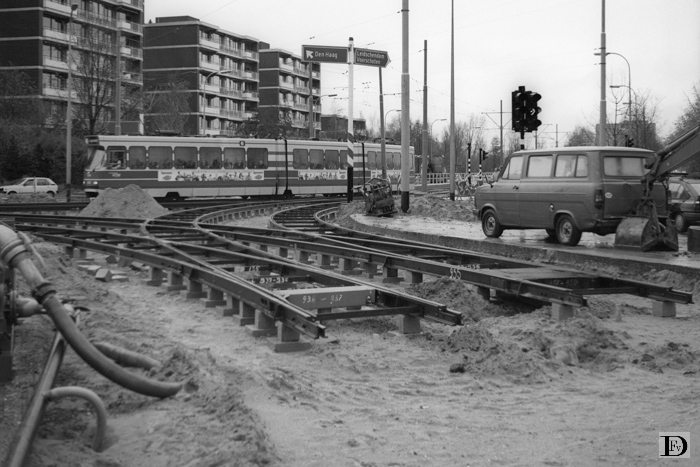 Voorburg Essestein. Mgr. Van Steelaan bij Hofzichtlaan, met de aansluiting van lijn 6 op de nieuwe doortrekking van lijn 3 in aanbouw.
