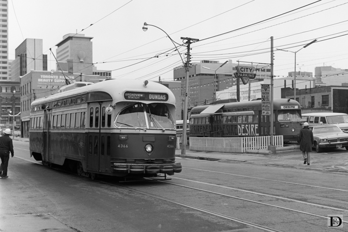 Dundas Street West bij Yonge Street met PCC 4366 op de Dundas lijn. Geheel rechts (ex) PCC 4716 als damesmodezaak!