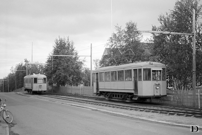 Kruising op de Hjalmar Lundsbohms vägen tussen de M 6 en de M 7, de twee laatste trams van de zaterdag. Op deze wisselplaats wordt rechts gehouden (Zweden!), op sommige andere wisselplaatsen weer links!