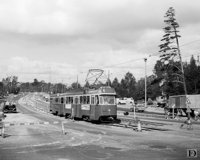 Paciuksenkatu met op de achtergrond de Munkkiniemen silta (Munksnäs bro). Lijn 4, 10 + 521, tijdens reconstructie werkzaamheden en spoorvernieuwing. 30 augustus 1967.