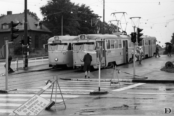 Zweden's "dagen H". Tussen zaterdagmiddag 2/9, 3 uur en zondagmiddag 3/9, 3 uur was de binnenstad van Göteborg afgesloten voor alle gemotoriseerd particulier verkeer. Op deze foto is de grens van deze zône: "Förlangt trafikförbud för motorfordon". Merk op, dat het bord nog voor de linkerweghelft staat, terwijl er reeds rechts gereden wordt (zie pijl en trams)!