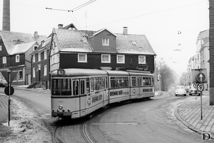 Schwelm, Hauptstrasse. Lijn 18 met een driedelig geleed motorrijtuig, no. 8016, wurmt zich vlak langs de huizen op enkelspoor aan de verkeerde kant van de weg de nauwe hoofdstraat van Schwelm in!