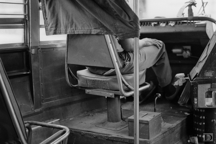 Stuurstand PCC car 2744. Het interieur is haveloos en de zitting van de voorste stoel ontbreekt!