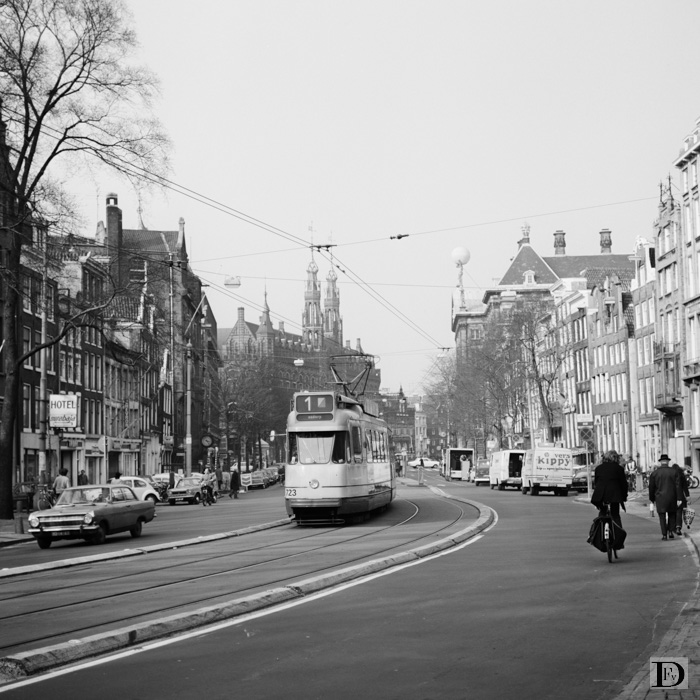 De gereconstrueerde Nieuwe Zijds Voorburgwal ter hoogte van de J. Koelensteeg, gezien in de richting van het Centraal Station.