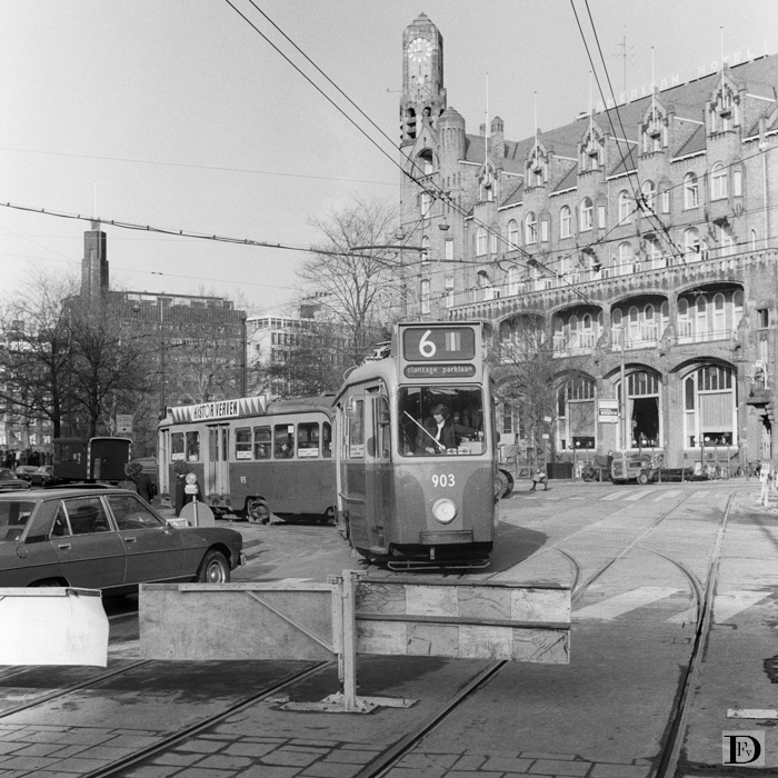 Leidseplein, drie-assig tramstel op lijn 6 rijdt de Weteringschans op, althans in die richting.