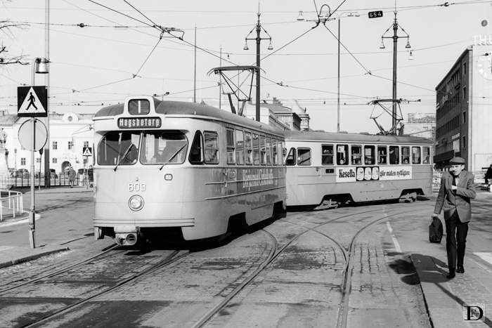 Östra Hamngatan op de hoek van de Södra Hamngatan, achter de tram bevindt zich de Fontänbron. Binnenkort zal de sporensituatie op dit kruispunt gewijzigd worden door de doortrekking van de trambaan over het noordelijke deel van de Östra Hamngatan.