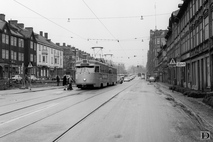 Artillerigatan, de straat langs de SKF fabrieken, met lijn 6, emr. 599 + ... . Links zijn de werkzaamheden voor een verbreding van de weg te zien, de bedoeling is dat de tram door deze straat een vrije baan (in het midden) krijgt.