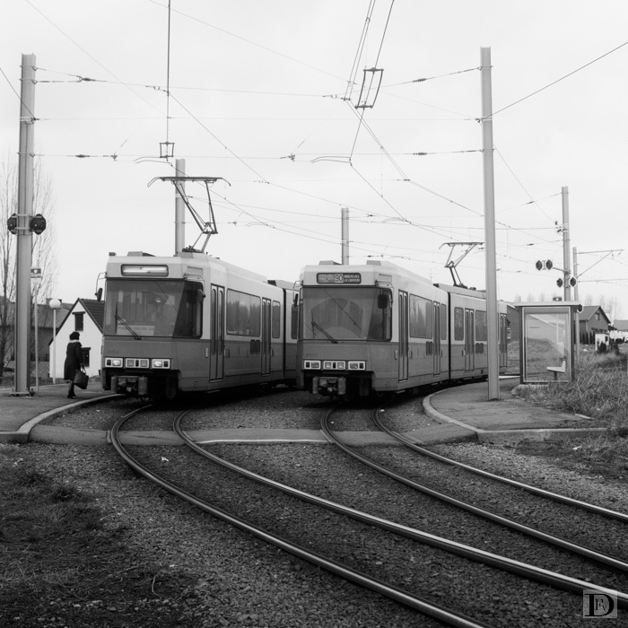Trivières bifurcation met kruising tussen twee trams op lijn 90. De rechter tram rijdt naar La Louvière, de linker via Binche en Anderlues naar Charleroi. Vroeger takte ongeveer aan de achterkant van de linker tram het zijlijntje naar Strépy af. De 6154 (links) heeft geen richtingfilm maar een bord achter de voorruit met de tekst "Prolongué Charleroi Sud 90". Rechts de 6145.