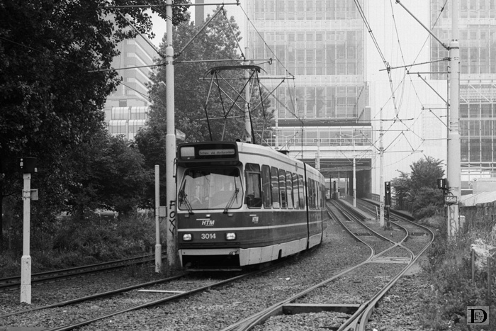 Korttraject tram Centraal Station - Scheveningen Noorderstrand via Madurodam wacht op vertrektijd. De richtingfilm is zwart op geel.