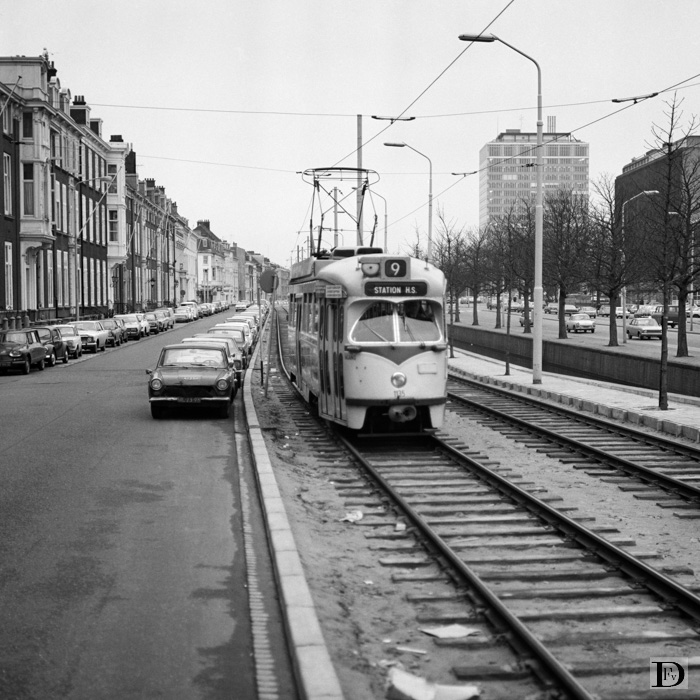 Prinsessegracht bij Bosbrug, gezien in de richting Scheveningen, kort na het gereed komen van de vrije trambaan. Lijn 9, PCC 1159 richting Station Holl. Spoor.